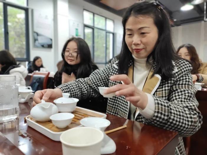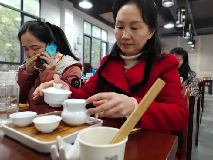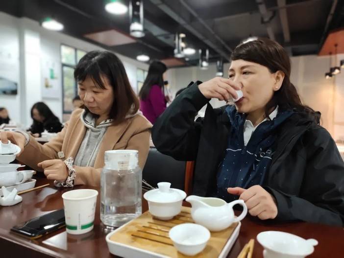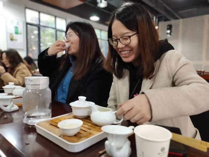 在茶香弥漫的茶室里,端坐于茶具前,开始学习茶文化。中国茶文化反映出中华民族的悠久的文明和礼仪。茶艺师向大家进行了茶文化知识讲座,介绍了中国人喝茶的起源、以茶代礼的风俗、茶道精神、茶的种类、泡制茶的工序等等。